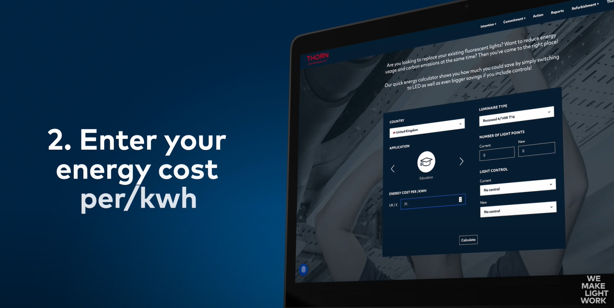 Accede a la exclusiva calculadora de Thorn Lighting y descubre cómo optimizar los costes de energía en tus proyectos de iluminación.